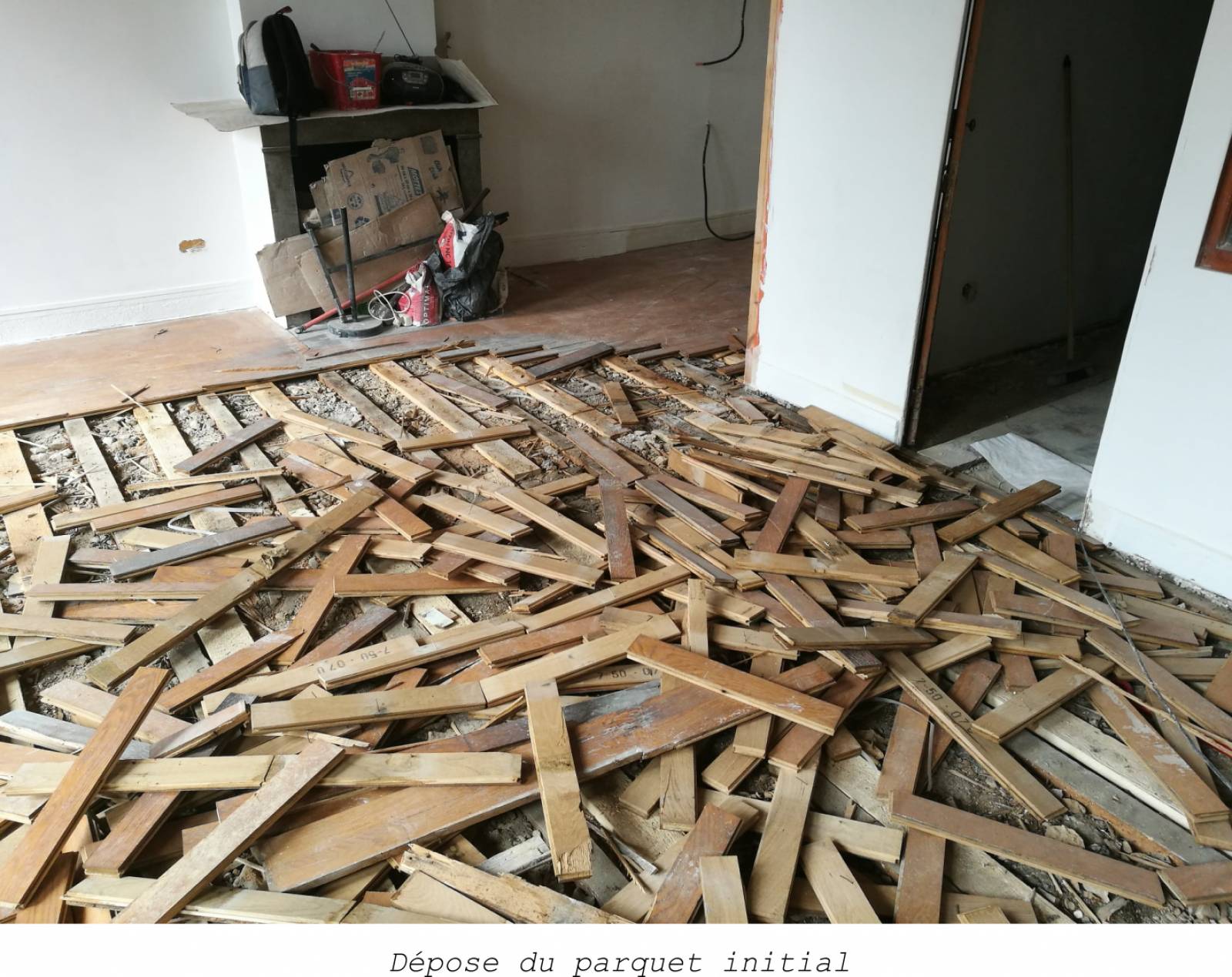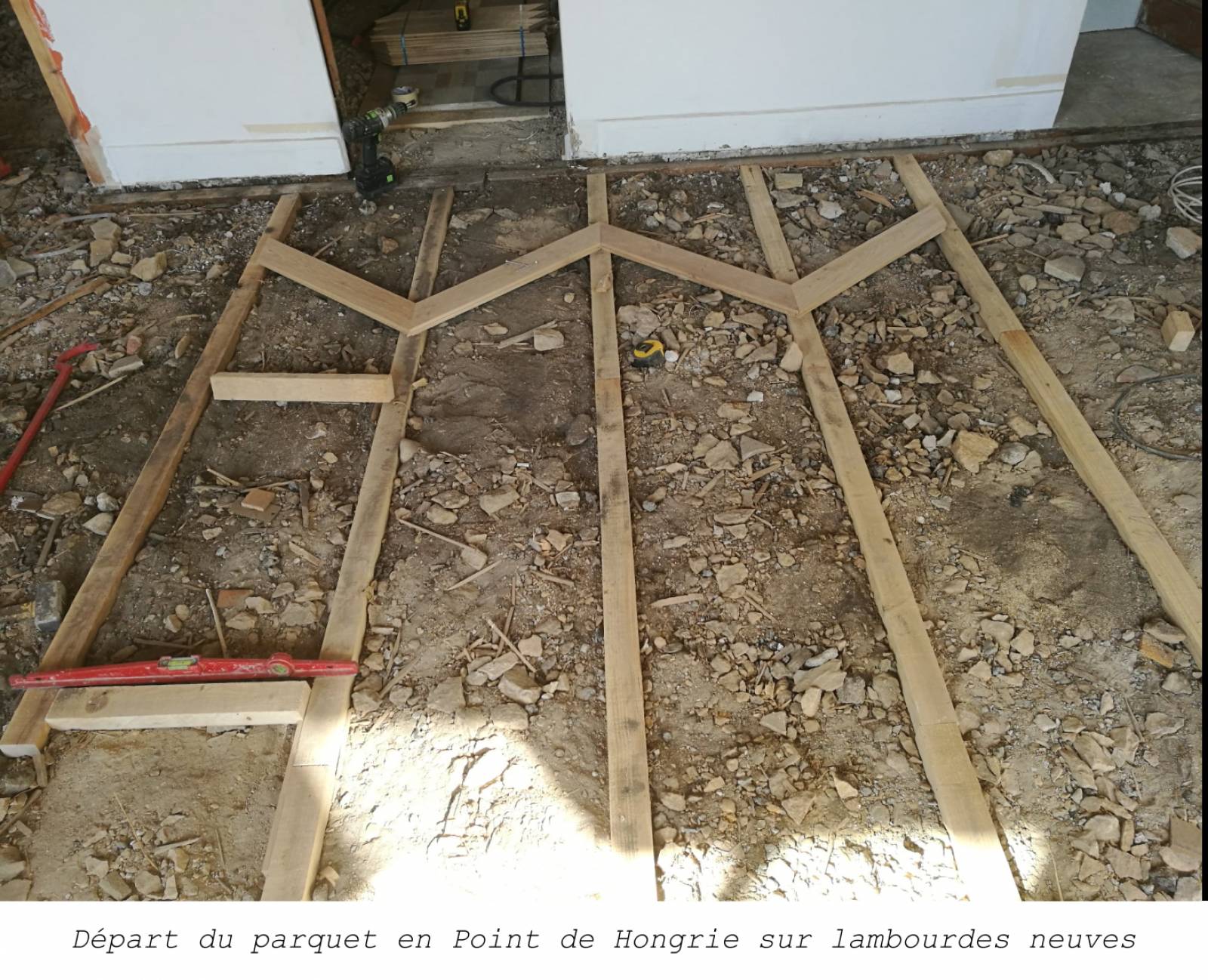 Pour ces travaux, il a fallu commencer par déposer entièrement le parquet existant (lame droite). L’étape suivante a été de poser des lambourdes neuves, qui vont créer le support pour accueillir le nouveau parquet. Ici, dans cet appartement ancien (et comme dans de nombreux appartements de la région lyonnaise), la matière présente sous le plancher est un sable appelé marin. Les lambourdes sont calées dans le marin, et le nouveau parquet est ensuite prêt à être posé. Dans le cas d’un motif en Point de Hongrie, les lames sont placées en chevron, avec un angle à 45° en bout. Le départ doit être précis et calculé, de manière que l’ensemble des pièces soit couvert de manière harmonieuse.