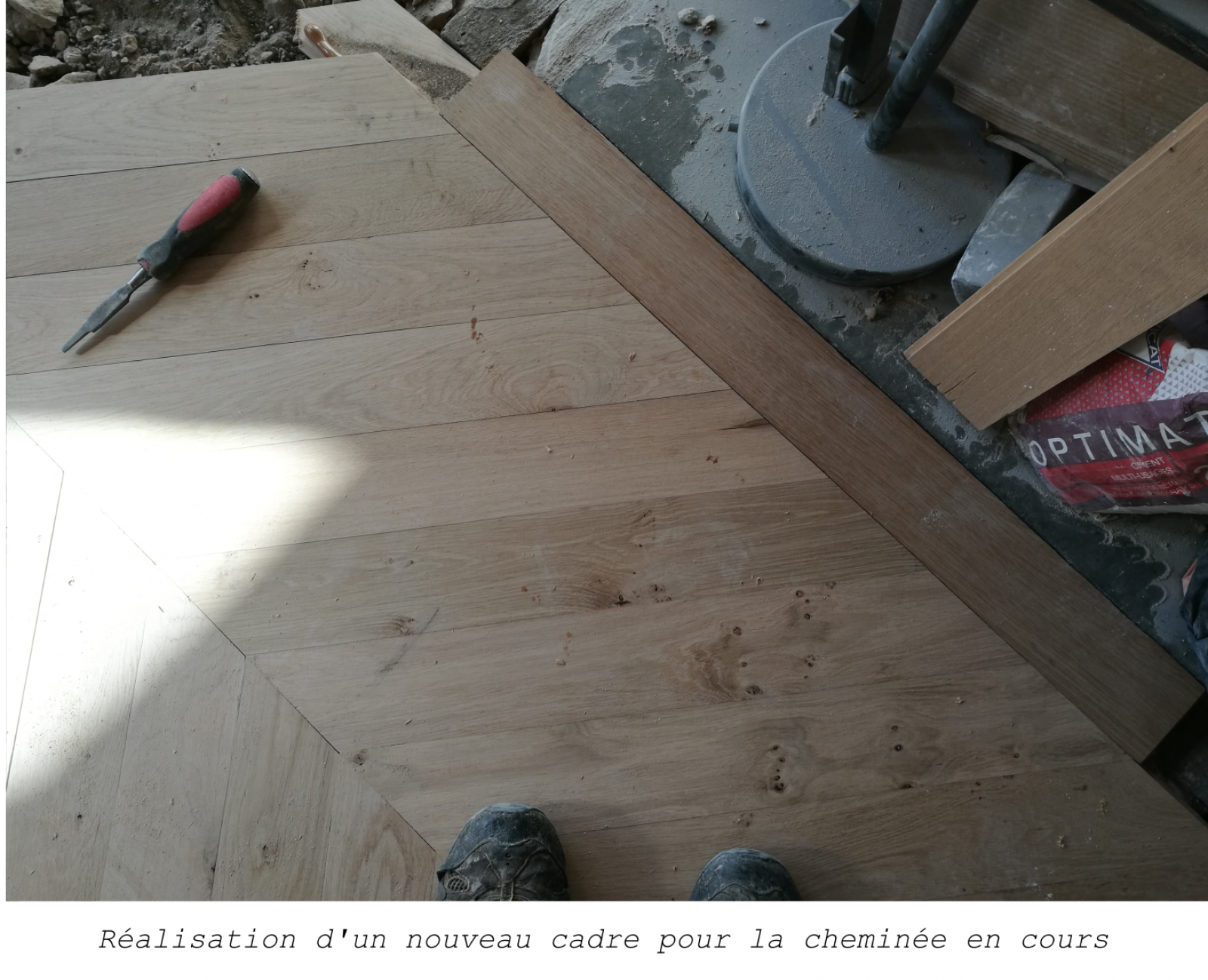 On vient ensuite poser toutes les lames, en les clouant une à une sur les lambourdes, jusqu’à couvrir la totalité de la surface, en chassant la tête des clous au chasse-clou. De nouveaux cadres sont posés autour de la cheminée et du motif en carrelage, et le parquet en Point de Hongrie vient épouser parfaitement ces cadres.