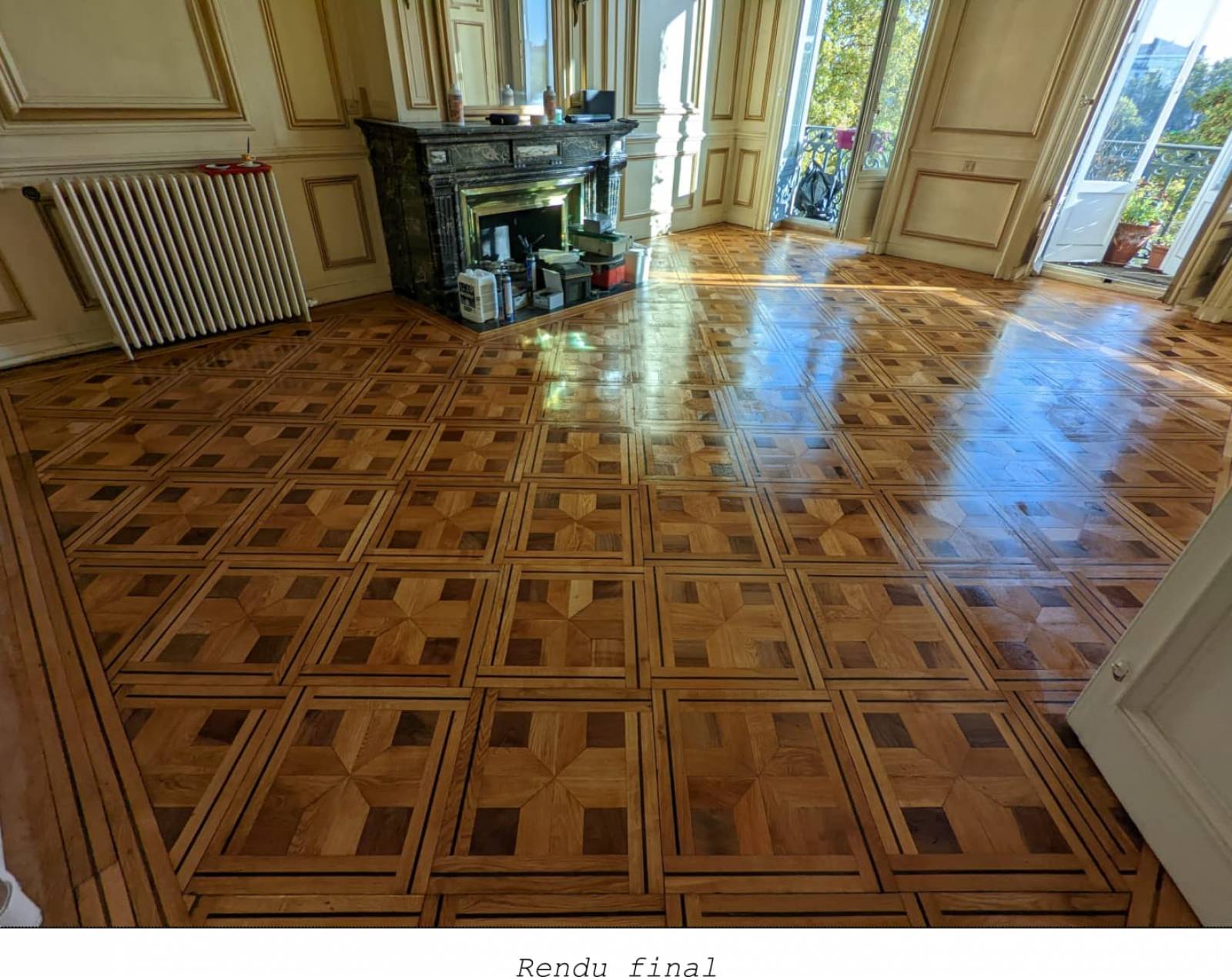 Dans cet appartement haussmannien, des panneaux sur mesure étaient présents au sol et qui avaient besoin d’être rénovés. Un des panneaux était trop endommagé pour être simplement poncé comme le reste de la pièce.