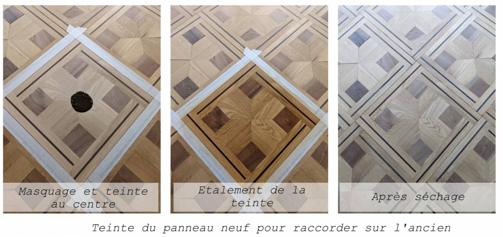 Le panneau a été déposé et jeté, et un nouveau panneau sur mesure a été posé pour être identique à ses voisins. Le vernis donnant une teinte plus foncée au bois, on peut voir la différence nette de teinte entre le panneau neuf brut (sans produit de protection) et les anciens panneaux ayant encore leur vernis. Mais même après ponçage intégral de la pièce, on peut toujours voir la différence entre le panneau neuf et les anciens. Le bois étant un matériau vivant, il évolue au fil du temps et sa teinte change. Si on applique un produit de protection tel quel, le panneau neuf va se démarquer très nettement au milieu des autres. Pour éviter cela, nous avons appliqué une teinte pour se rapprocher au maximum de la teinte actuelle des anciens panneaux. On peut voir après séchage de la teinte que le panneau neuf se fond dans les anciens sans démarcation.