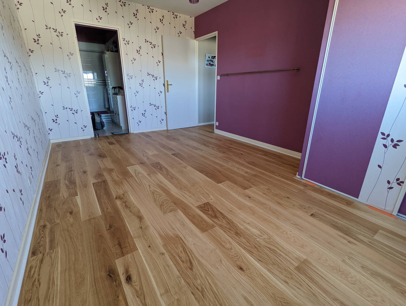 À la suite d’un dégât des eaux, nous avons remplacé à l’identique le parquet dans une chambre de cette habitation. L’ancien sol a été démonté et évacué. Nous avons posé une nouvelle sous-couche isolant phonique pour pouvoir accueillir le parquet remplaçant. C’est un parquet contrecollé 3 plis, ave...