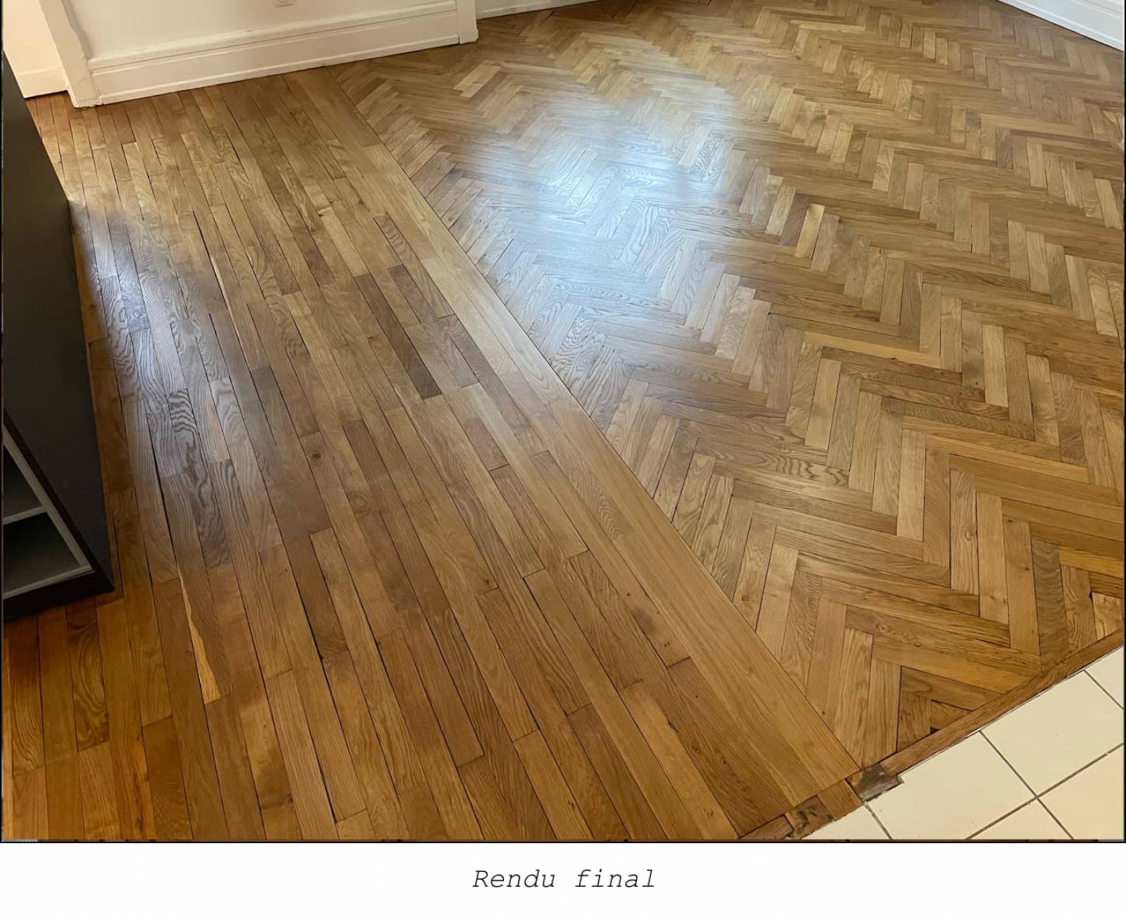 Réparation et restauration d'un parquet massif très abimé avec lames manquantes à Décines