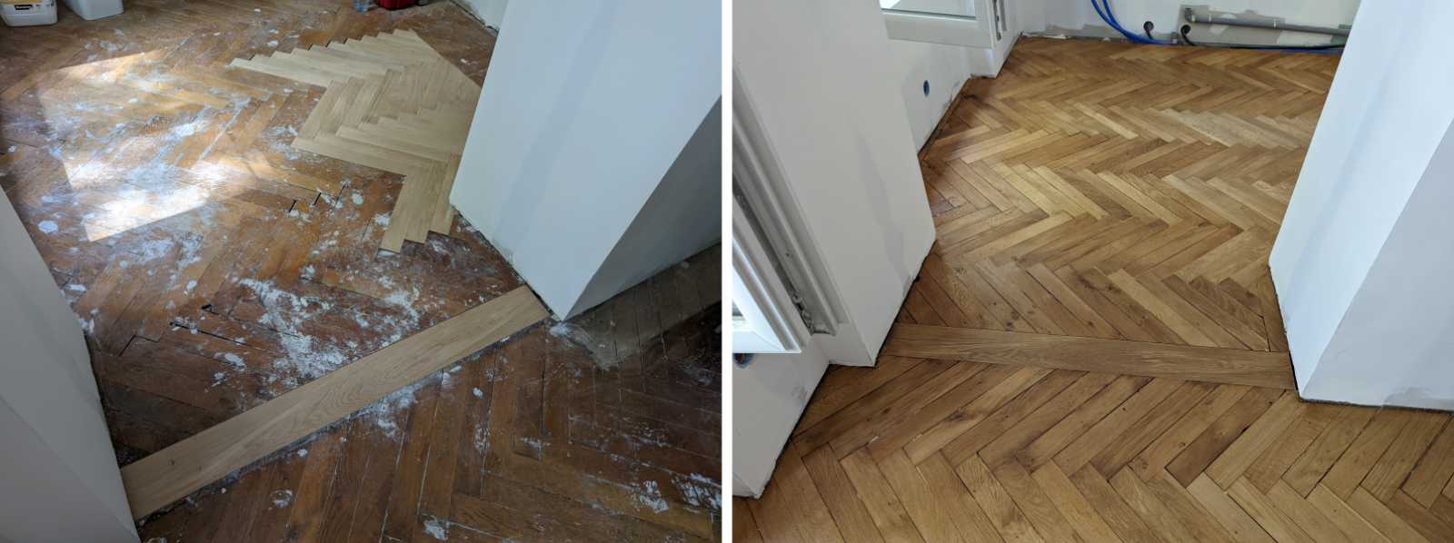 Réparation de parquet bâton rompu sur mesure et pose de seuil massif pour raccorder entre deux pièces Réparation de parquet bâton rompu sur mesure et pose de seuil massif pour raccorder entre deux pièces